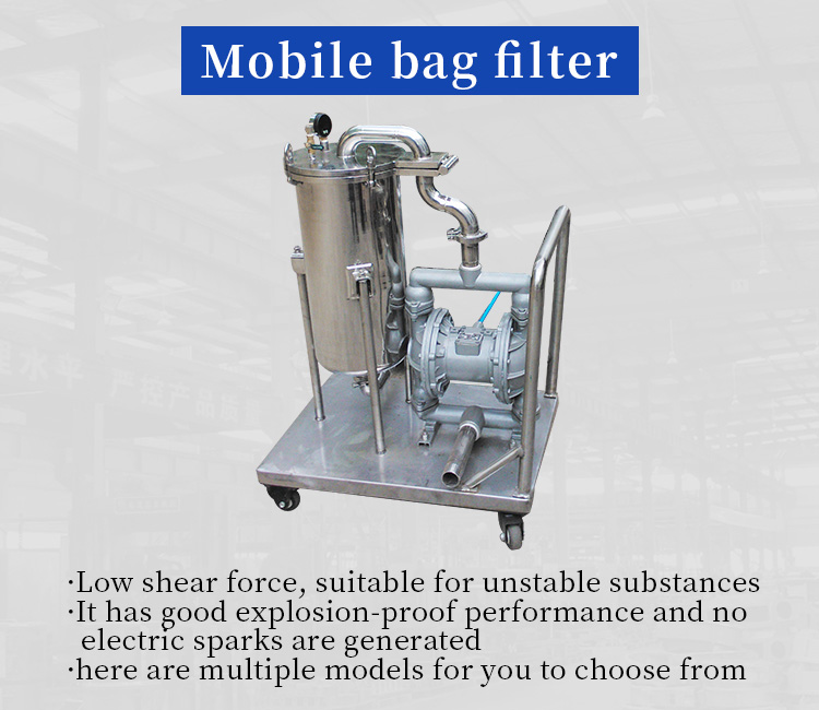 The bag filter is a simple, efficient and economical filtering equipment. It includes a filter housing, a mesh basket and a filter bag. The operation is simple and convenient. The fluid to be filtered enters the filter bag from the top, and the impurities are blocked in the bag, so that a clean fluid is obtained. The bag filter has been widely used in complete sets of equipment with a filtering accuracy of 1-1000um. This mobile bag filter device is installed on a trolley and can be moved to any production line at will for work. It is also suitable for traditional equipment. When used with a filling machine, it can form a filtering and filling production line that is completely under automatic control. The shear force is extremely low, which is suitable for unstable substances; compressed air is used as a power source, which is suitable for medium and high viscosity materials; it has good explosion-proof performance and no electric sparks are generated. A safe and efficient filtering effect is achieved. We have a variety of models to meet your filtering requirements.